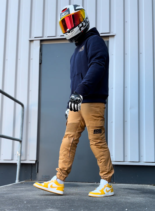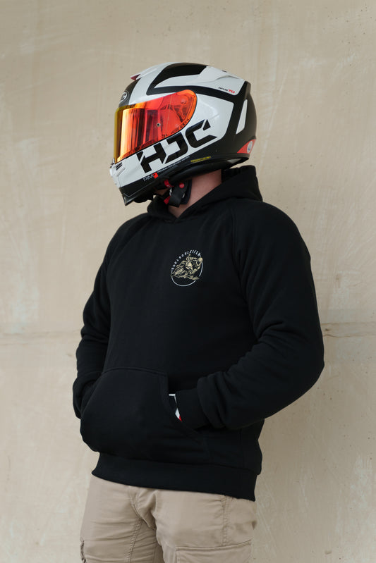 Der Hoodie besitzt wasserabweisende Kangaroo-Taschen mit Zippern, die du auch mit Handschuhen einfach greifen kannst! Der Schnitt ist zudem extra für die Sitzposition auf einem Motorrad angepasst: